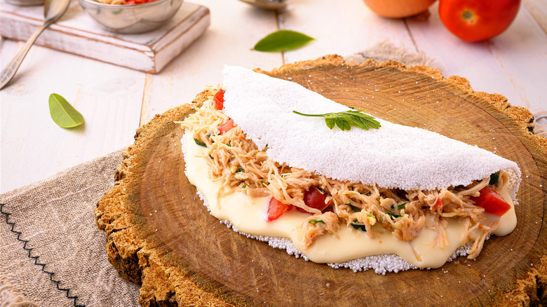 The crisp tapioca shell offers a portable, tasty, and gluten-free outer layer to help support whatever filling you choose. To make it yourself, just mix tapioca starch with a bit of water, making sure it remains fairly dry. Flatten the mixture onto a nonstick pan and cook it for 30 seconds, and then you'll be ready to customize it with your fillings. The tapioca wrapper is best eaten when it's warm and pliable and has very little taste when eaten solo. So, it's a blank slate to play with different flavors and craft a unique breakfast "sandwich" that you may not expect.