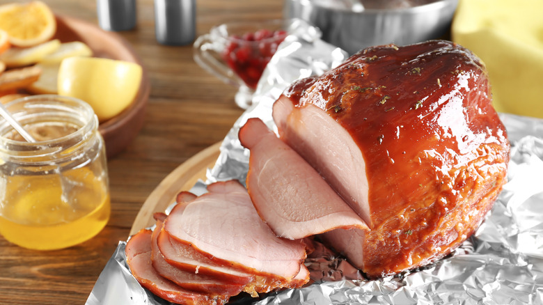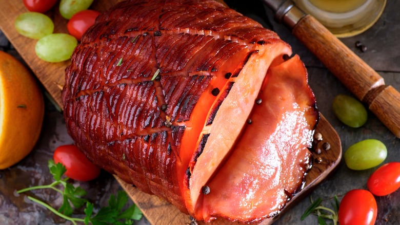 You've probably noticed that most baked ham recipes include a glazing step to add taste, color, and texture to the outside of the cured pork. A good glazed ham recipe (like our bourbon-packed glazed ham) will include both sweet and savory flavors to balance the salty nature of the meat, and there's often an ingredient added for a boost of umami, like toasty bourbon or molasses. One ingredient you might be missing out on that can really enhance roasted ham is a fortified wine — for example, port, Madeira, or Marsala.