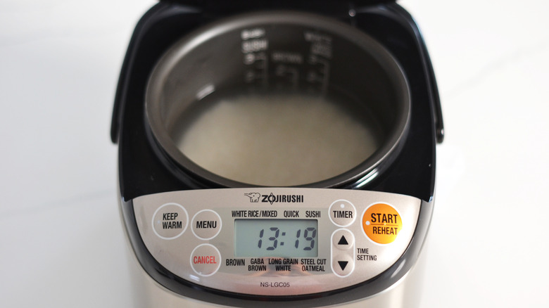 To make perfect sushi rice, you'll start with uncooked Japanese short-grain rice. Just as you would when preparing plain Japanese white rice, wash and drain the rice 3 times, and then let it soak for about 30 minutes before cooking. Some rice cookers have markings that show the amount of water required to cook different types of rice, such as brown, white, or sushi rice. If your rice cooker doesn't have these markings, just use a 1:1 ratio of water to rice by volume.