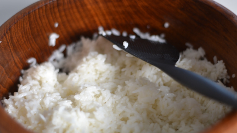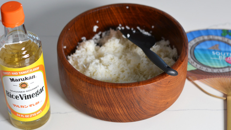 - Fold in the vinegar with a shamoji (rice paddle) or spatula while fanning the rice to help cool it down. It helps to have one person fan the rice while the other person mixes.