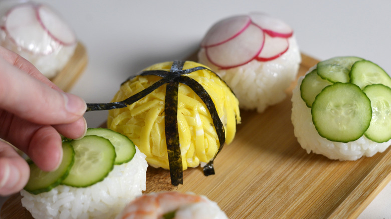 Once you've selected your ingredients, play around with presentation and layering. Cucumber can be sliced into thin rounds or shaved into long strips that are woven together like a lattice pie crust. Instead of cutting the usuyaki tamago (sheet of egg) into kinshi tamago (thin strips of egg), why not use a larger piece to envelope the entire ball of sushi rice? Try different combinations of ingredients, keeping pattern, texture, and color in mind — think of the dish as edible art.