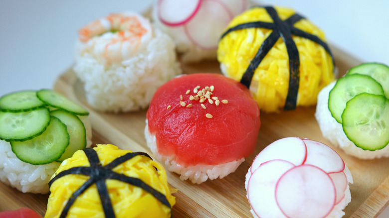 The temarizushi topping possibilities are endless, and it can easily be vegan or vegetarian –- just focus on veggies like avocado, carrot, okra, or lotus root. If you're in the mood for seafood, experiment with raw or cooked fish, roe, uni, or scallops. Wary of uncooked fish? Try imitation crab, smoked salmon, prosciutto, or ham. Garnishes like chives or scallions, zested or thinly sliced citrus fruit, and microgreens add additional color, crunch, and flavor.