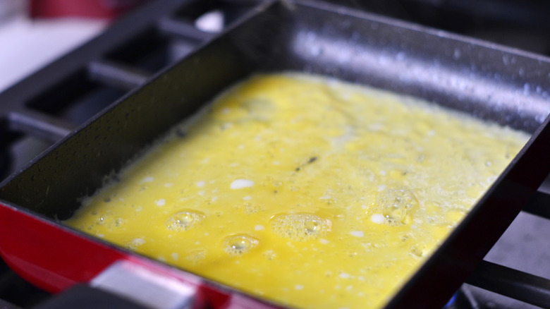 - Heat a frying pan on medium-low heat. Coat with oil and add just enough egg to cover the bottom of the frying pan.