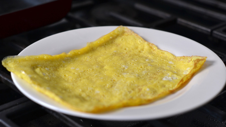 - Transfer the sheet of egg to a plate to cool, and repeat the cooking process with the remaining egg mixture.