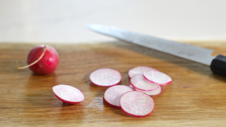 - Slice the cucumber and radish into thin rounds using a mandolin or sharp knife.