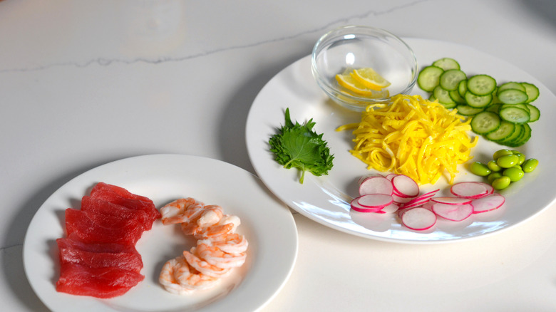 We also use boiled shrimp, high-quality tuna (make sure it is safe for raw consumption), cherry belle radishes, cucumber, and edamame as toppings. For garnishes, toasted sesame seeds, shiso, and lemon are great for additional flavor and texture. To serve, you'll want to have wasabi and soy sauce handy.