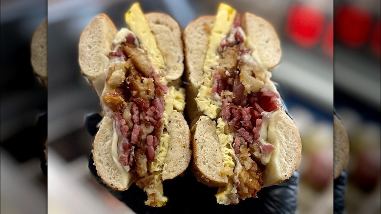 While the lunch menu highlights staples like matzo ball soup and pastrami on rye, the pared-down breakfast menu shouldn't be missed. A good Jewish deli would be remiss not to offer a bagel and lox — and Rye Society's Hebrew Hammer (with lox, tomato, pickled red onion, capers, cucumber, dill, and plain cream cheese on a bagel) fits the bill. I'll be planning a visit around Hanukkah to try to get my hands on the Hanukkah Hangover — a bagel topped with chopped corned beef, latkes, melted provolone cheese, and Russian dressing.