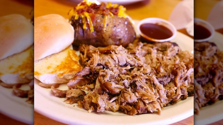 Texas is arguably the best state to enjoy good ol' American barbecue, with cities like Austin, San Antonio, and Houston taking the reins. But, did you know Texas Roadhouse has no original ties to the Lone Star State? That's right. The franchise actually got its start in Clarksville, Indiana, and is now headquartered across the river in Louisville, Kentucky. This lack of authenticity may rile up some Texans. It also may explain why one of the chain's prominent barbecue dishes, the pulled pork dinner, doesn't live up to the Southern state's name.
