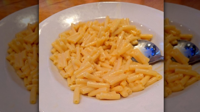 Kraft is still on the menu at various Texas Roadhouse restaurants. Within the last couple of years, the chain has attempted to redeem itself by switching to what it calls "homemade mac and cheese" at many of its locations. But don't get your hopes up. It sports a wildly unbalanced ratio of gloopy cheese to noodles and manages to lack much character. An ultra-mild cheddar seems to be the cheese of choice, and seasonings — even basics like salt or pepper — are scanty. Plus, if you were hoping for some fancy mac and cheese fix-ins like panko bread crumbs, you won't get it. At least you can top it with a light helping of cheddar and bacon for an additional $1.29.