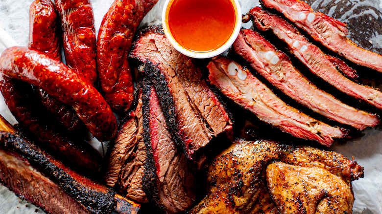 We'll also add that, if burnt ends are offered — pieces sliced from brisket's fattiest sections — diners should sample a taste, as it's a surefire way to tell whether a barbecue joint knows its stuff. And then there's the sauce that will accompany the plates you've ordered. In the Carolinas, a vinegary-red peppery sauce has gained a reputation as the country's oldest barbecue sauce, whereas in Lexington, chefs add ketchup to a similar red pepper and vinegar base for diners to pour onto their meals. Over in Alabama, a mayo-based white sauce has made a name for itself, and the condiment can be found drizzled onto chicken, coleslaw, potato salad, and macaroni dishes.