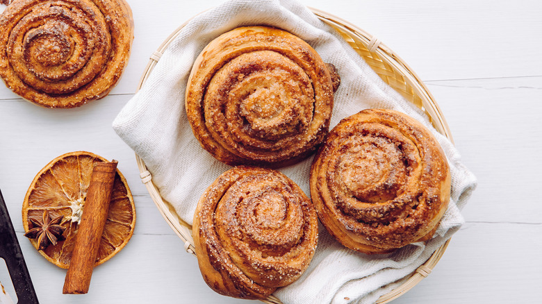 If you've used canned orange-flavored cinnamon rolls for breakfast sandwiches before, the citrus zest in Costco's morning buns will provide a similar flavor profile minus the icing. One Reddit user keeps their Costco morning bun breakfast sandwich simple with eggs, bacon, and butter. Many users responded to the thread saying they plan to use them for breakfast sandwiches too, while others suggested they'd make a fun twist for French toast. We think there's a strong argument to adding sliced cheddar to make a classic bacon, egg, and cheese sandwich with the morning bun for contrasting sweetness and sharpness.