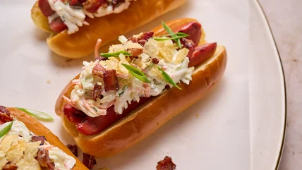 These perfectly charred, grilled hot dogs are butterflied, meaning they have extra room for creamy, crispy toppings like bacon, coleslaw, and potato chips.