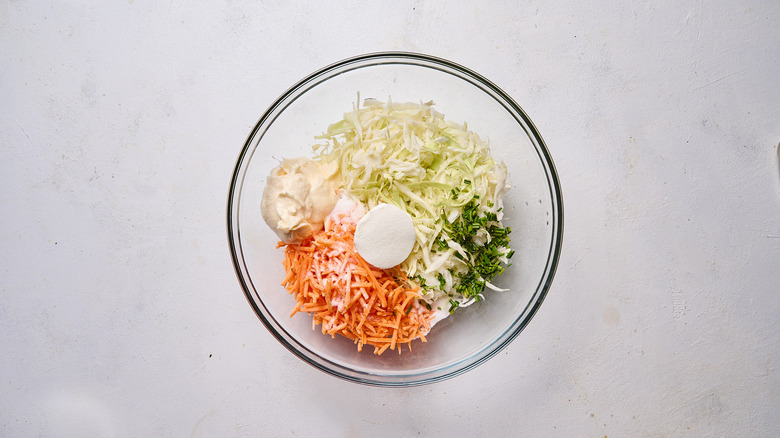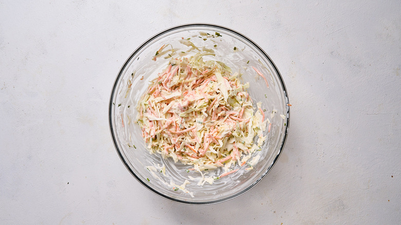 If you've ever thrown together a batch of coleslaw only to be left with a watery, mushy mess, you might be making a few common coleslaw mistakes. When putting together the perfect slaw, there are a few prep steps to remember so your dish turns out perfect. If you're making slaw from scratch, remember to wash the cabbage and carrots before shredding. Shred using a mandoline for perfectly even, thin slices, or use a food processor for smaller chunks, and then leave the veggies to sit in the bowl while you prep the remainder of the recipe. To help draw out moisture from the cabbage, you can also lightly salt the vegetables, draining any excess liquid before adding the coleslaw dressing.