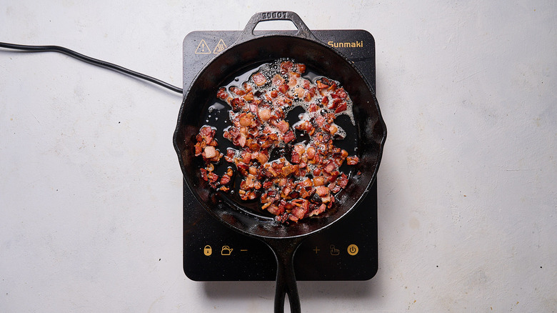 - Add bacon pieces and cook until crispy, about 5-8 minutes. Set aside.