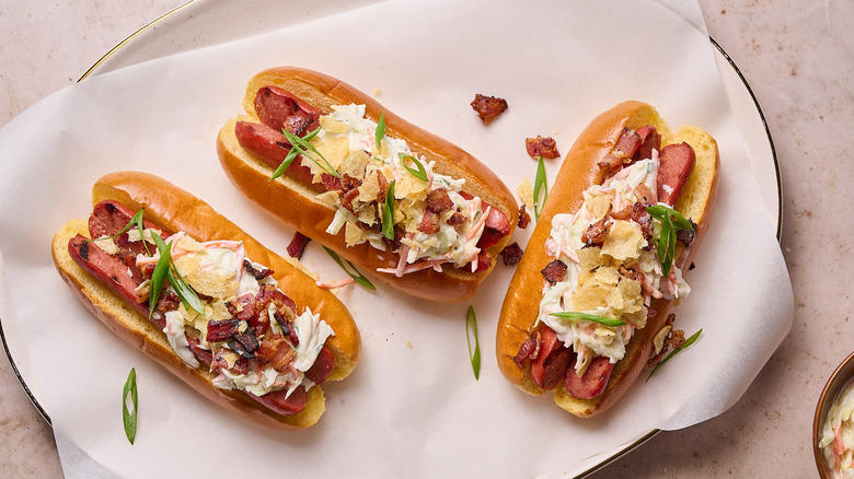 Nobody ever claimed that hot dogs are healthy. In fact, the places you're most likely to eat a hot dog are almost certainly designed for indulgent food choices, like baseball games or backyard barbecues. There's no use in trying to fit hot dogs into a nutritious mold, so why not lean into the gluttony? This creation by recipe developer Michelle McGlinn loads up a charred, all-beef hot dog with an array of toppings — like creamy, mayo-based coleslaw, crispy bacon, and crunchy potato chips. Yes, you read that right: We put the potato chips right on the dog.