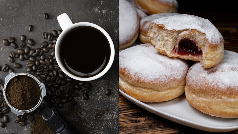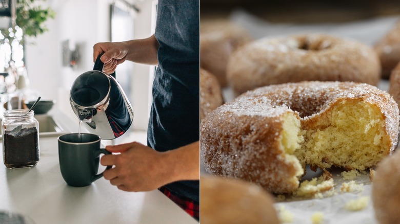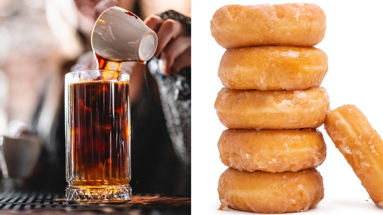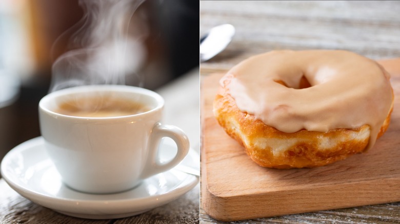 Few things in life can compare to the magic that happens when coffee meets donut. A perfect, pillowy pastry accompanied by a hot and fresh cup of joe, no matter how you like it, makes a great breakfast on the go or an ideal treat-yourself snack. Dunkin' may be credited with popularizing the iconic pairing when it first opened post-WWII, slinging nothing but coffee and donuts. The chain quickly became associated with police officers who frequented the shop looking for a midnight snack and coffee to help them power through the graveyard shift. The pairing continues to thrive, with most donut shops in the U.S. serving coffee alongside fresh pastries.