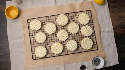 - Using a spoon or squeeze bottle, drizzle lemon icing over the cooled cookies.