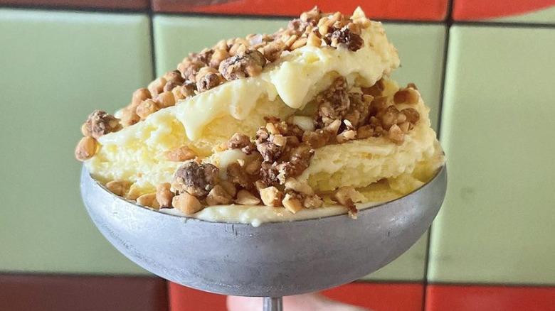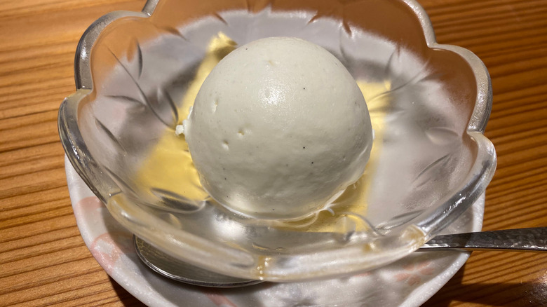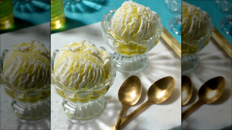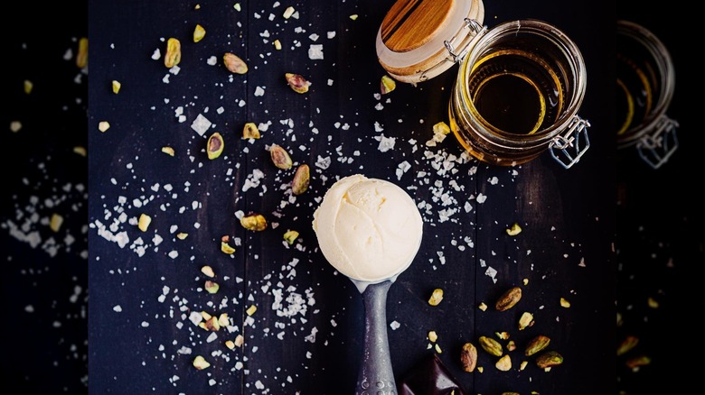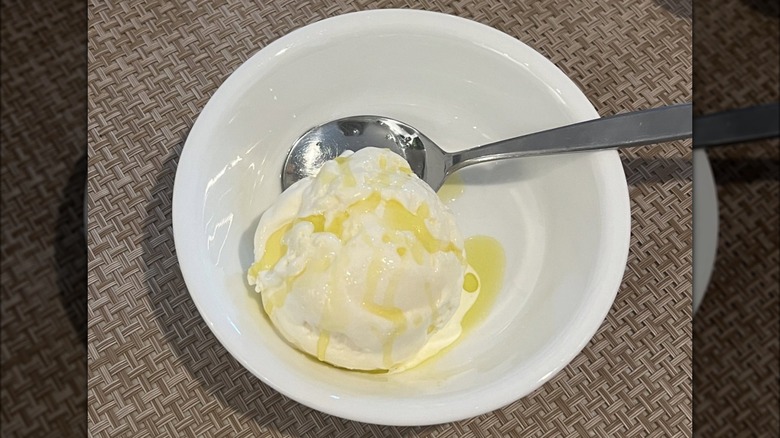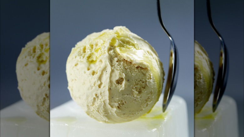 While 200-plus types of olives can be found in Spain, picual — which produces a fruity varietal of olive oil — is the most common. This olive is naturally very high in oil content, providing a high yield for consumer products. Tasters will find notes of almond, pepper, and olive leaf in this oil, making it the perfect slightly bitter complement to any flavor of ice cream, from chocolatey to fruity. Try pouring this on top of pistachio ice cream for a deliciously nutty and creamy bite. To level up your dish, you can add crumbled cookies or chopped nuts on top of your olive oil-crowned ice cream. The silky oil, creamy ice cream, and these crunchy toppings will provide a lovely textural contrast to your dessert break.