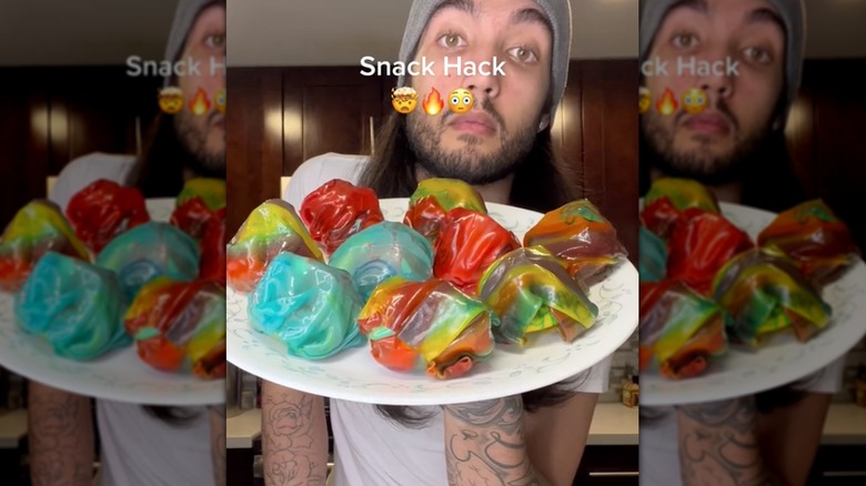 The hack here is simple: you'll only need fruit roll-ups, vanilla ice cream, and your freezer. Be sure you get the kind of fruit roll-up that unrolls in sheets, not the Fruit by the Foot variety. The Andy's Life TikTok account shows us how to prepare the snack by unfurling the fruit roll-ups and scooping the vanilla on top. Take the corners of the fruit roll-up and wrap them around the ice cream, pressing the corners in and sealing the edges. Then, place it back in the freezer and give it time to come together. Upon removal, take a bite and enjoy all that crunchy goodness from your now-frozen fruit roll-up mochi-like treat. Of course, you can try other varieties of ice cream, but you'll probably want to stick to vanilla or fruit options to avoid unappetizing flavor combinations.