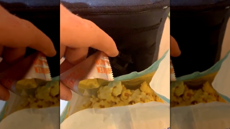 Pop the popcorn as you typically would, and while it's still warm, open the bag up and dump in the seasoning packet from your ramen package. Swervinervin uses chicken ramen, and we think this is a great flavor to start with, knowing you can experiment with flavor from there. With the leftover noodles this creates, you could throw them out, but we prefer keeping them in a plastic bag and using them the next time we want to get fancy with our ramen noodles and make a sauce at home rather than relying on the package. You could use a similar hack on your next trip to the movie theater and simply bring along a ramen packet for when you order your popcorn at the theater and mix it in as you see fit.