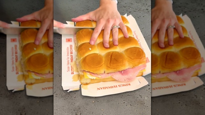 Brooke from mealsandmunchies demonstrates slicing them so that you have a large top and a large bottom, but all the rolls are still connected together. Then, add in all of your condiments, meats, and cheeses, and then put the sandwich top back on. From there, cut the sandwiches down so that each one is the size of a typical Hawaiian roll, with the filling on the inside, carefully maintaining the rectangular shape of all the rolls together. Then, use the white cardboard that comes along with the rolls to help reform it even better. Slide it right back into the bag it came in, use the closure to seal it, and you'll have sandwich sliders ready for your next outdoor adventure or picnic.