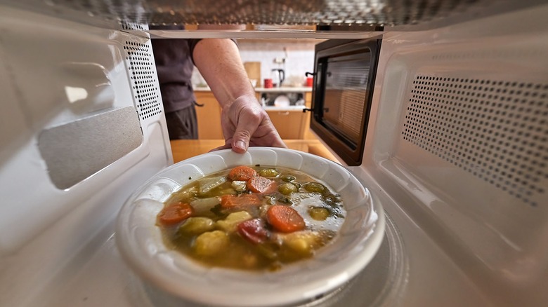 Even if you don't have precooked noodles, you can cook dry pasta in the microwave without changing any steps to your leftover microwave soup preparations. Simply add a few cups of water to uncooked pasta and nuke it in the microwave for around five minutes. Then you can take the pasta out, add more broth or water to the bowl, and pile on the rest of your leftovers before placing it back in the microwave for another five to eight minutes.