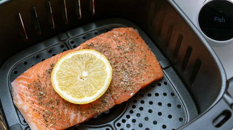 Whether you place the skin face up or down, a light coating of high-heat oil like avocado or grapeseed oil (which you should consider cooking with more often) helps crisp the salmon skin — just be sure to brush or spray the salmon lightly before popping it in the air fryer. Avoid overcrowding the air fryer basket, as this can prevent proper air circulation and result in uneven cooking. Finally, parchment paper under the salmon might make for an easier cleanup when finished.