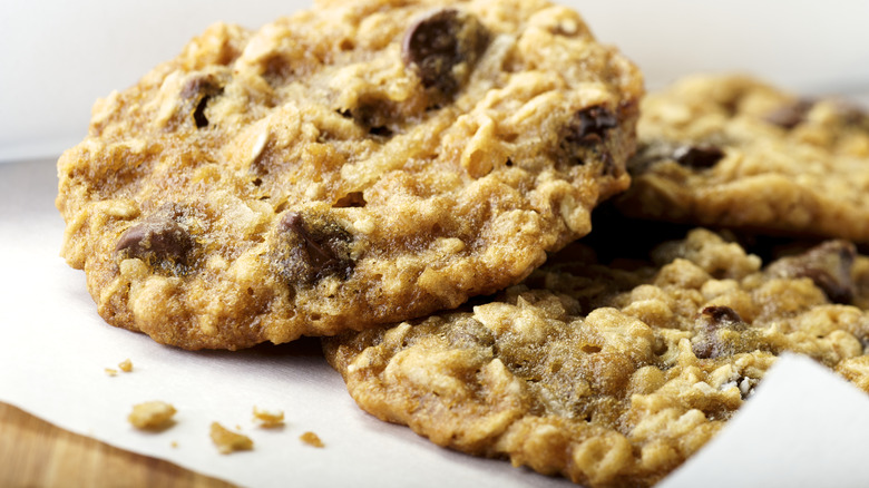 If you're looking for a way to add a true crunchy factor to your oatmeal cookies, then nuts are the foolproof option. Sure, it may seem obvious to add nuts to cookies, but if you always go the oatmeal raisin route, then perhaps you've never considered the fact that you can swap those raisins for chopped walnuts, pecans, almonds, cashews, or even macadamia nuts. With the oatmeal cookie providing a chewy base, chopped nuts will add just enough crunchiness to transform the texture of your treats all while adding a nice nutty flavor, too.
