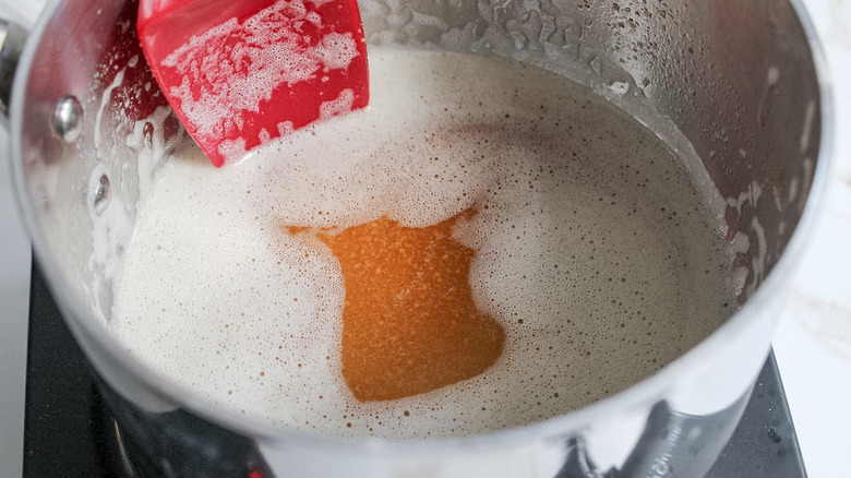 It's easy to make mistakes when browning butter — like letting the butter burn or not stirring enough — but the overall process isn't too complicated. You'll start by placing the butter in a saucepan over medium heat, then you'll continuously stir as the butter melts and starts to brown. It should only take a few minutes from start to finish, and once the butter starts to smell aromatic and nutty, you'll know it's time to cut the heat. If your cookie recipe doesn't specifically call for using melted butter, then be sure to give your fresh brown butter a chance to cool down before adding it in with the rest of the cookie ingredients.