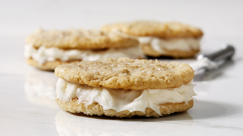 The only thing better than one cookie is two cookies, and the only thing better than two cookies is two cookies with a thick layer of frosting binding them together. Yes, we're talking about cookie sandwiches, and we'd argue that there's no better cookie candidate for a sandwich than oatmeal ones. Oatmeal cookies hold their shape well, so you don't have to worry about them crumbling as you try to assemble the sandwiches. And since oatmeal cookies are pretty neutral on their own, there's nothing like a layer of buttercream to help sweeten up the deal.