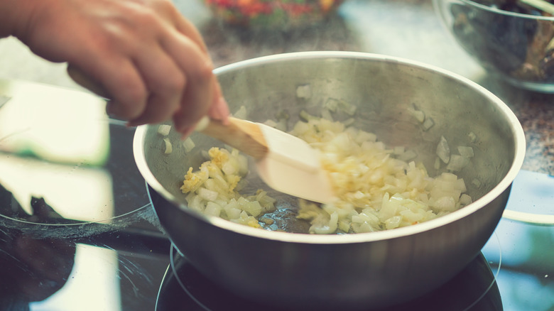 Start with a preheated pan over low or medium-low heat when sweating an onion. You don't want the pan to ever get hot enough to brown the onion. When adding the onion with a little oil to the preheated pan, you'll note a slight sizzle, which is good. A pinch of salt at this point will work with the onion, and it might expel its water by osmosis. Some of the water will evaporate, some will draw back in. When the water disappears, you're still not done. Taste the onion; it will still have some raw flavor and crunch. Let the onion cook until the rawness and crunch are gone — about 15 to 20 minutes. Caramelizing onions follows the same process; just let them cook longer until deeply brown. Allow 45-60 minutes for complete browning and full flavor.