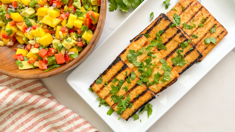Get ready for a flavor explosion with this grilled tofu and mango salsa recipe. Back in the day, tofu got a bad rap for being on the bland side. But it's grown enormously in popularity lately, because with the right marinade and a few cooking tricks, tofu can be bursting with flavor. The combination of fresh lime juice, soy sauce, and maple syrup used in the tofu marinade gives you a tangy kick, a savory richness, and a hint of sweetness in every bite. Paired with the zesty and juicy freshness of mango salsa, it is a match made in heaven. Tofu, an excellent source of vegan protein, is no stranger to the grill, which adds another layer of appeal by imparting a smoky flavor and a satisfyingly firm texture that can mimic the characteristics of grilled meats.