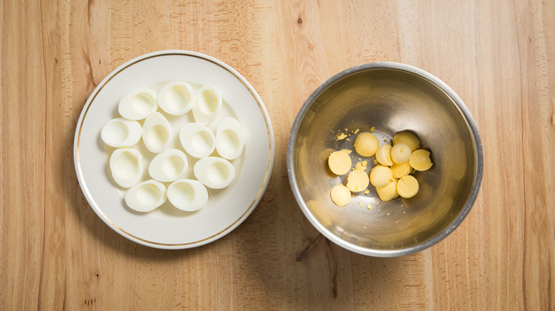 Carefully remove the yolks and place them in a mixing bowl, setting the egg white halves aside on a serving dish.