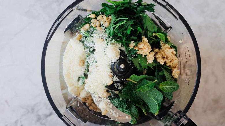 - Make the mint pesto: Combine mint, parsley, Parmesan, pine nuts, and the 2 whole garlic cloves in a food processor.