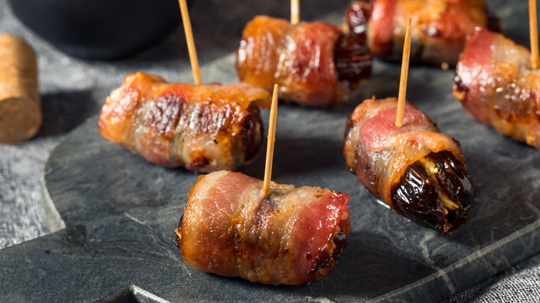 If you love the combination of salty and sweet, try wrapping dates in bacon. Dates — which are tropical stone fruits that grow on date palm trees — are naturally high in sugar, giving them a satisfying sweetness that complements the savory notes of bacon. They're also delightfully tender and soft, offering a delicious contrast against the crispiness of bacon.