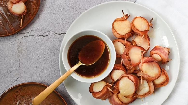 If you're seeking a fancier take on the bacon-wrapped appetizer, reach for scallops. Though more expensive than other options, this approach will be worth it if you love seafood. Again, you'll need to partially cook the bacon strips before wrapping them around scallops, as this will ensure they fully crisp up. It's also a good idea to cut each strip of bacon in half for even and thorough cooking.