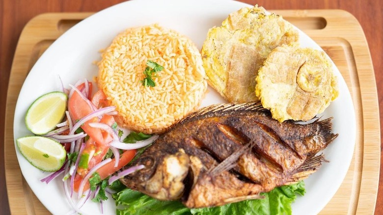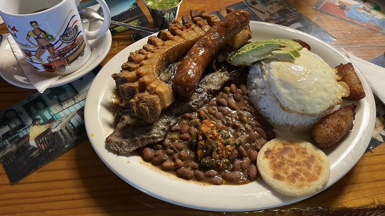 One of our favorite items on the menu is the bandeja paisa, a hearty meal that came from the Antioquia department of Colombia. It's a diverse platter featuring sausage, an arepa, red beans, avocado, beef, and sweet plantain. Imagine a full English breakfast, but make it Colombian.