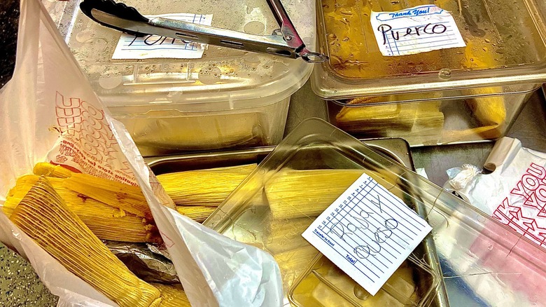 The tamales are a treat — with moist masa and flavorful fillings. For an extra kick, drizzle salsa roja or salsa verde over them. And definitely grab a fried chicharrón from the butcher; when broken into small pieces on top, it's the perfect crunchy addition to your tamale feast.