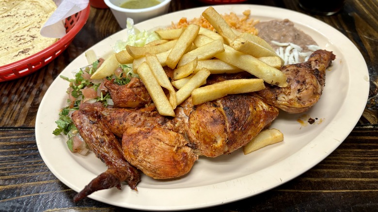 This hearty plate of chicken — a common dish sold by street vendors in Sinaloa, Mexico — is marinated in a mixture of spices, smoked over an open flame for several hours, and finished on the grill. Pollo al carbon can be ordered in quarter, half, or whole bird sizes at this restaurant. Each portion size is complete with sides of fries, salad, rice, beans, tortillas, and salsa — which makes it a whole meal plus leftovers. Los Picosos sets itself apart from the old taco and burrito song and dance with this idiosyncratic and relatively cheap feast.