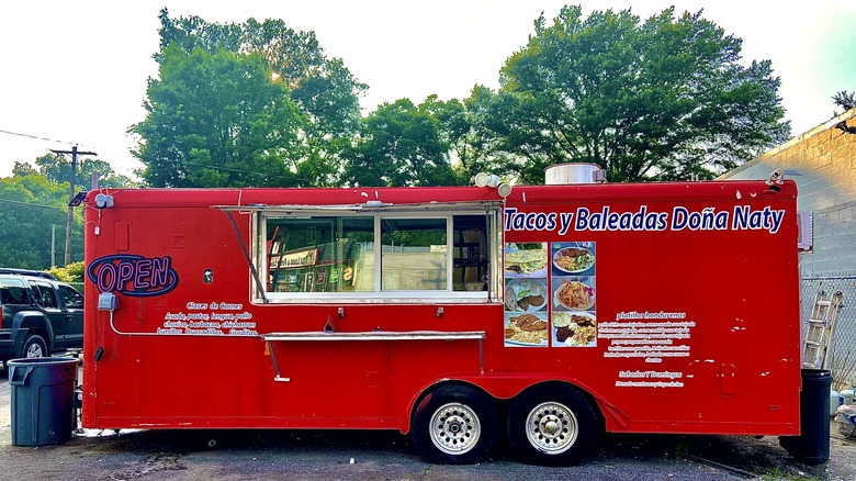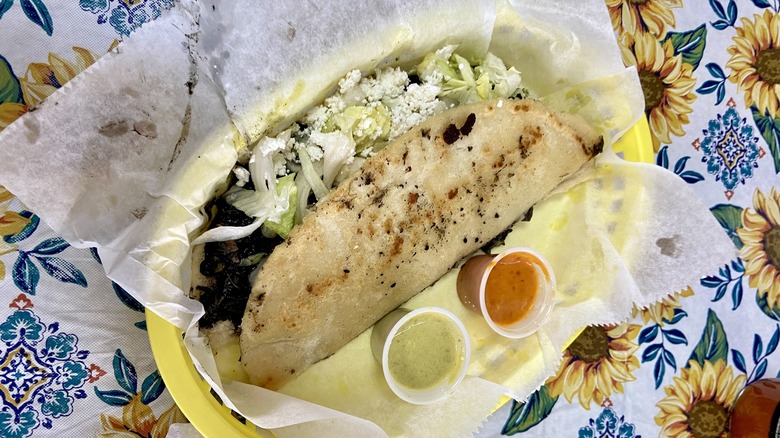 The lack of a readily available menu adds to the mysterious allure of Doña Naty, but you can find a list of offerings and photos of a few menu items on the side of the food truck. The baleadas are the star of the show here. We order ours con carne — which adds steak to a bed of eggs, refried beans, and queso duro, all wrapped in a chewy flour tortilla. They're served with a tangy and creamy avocado salsa.