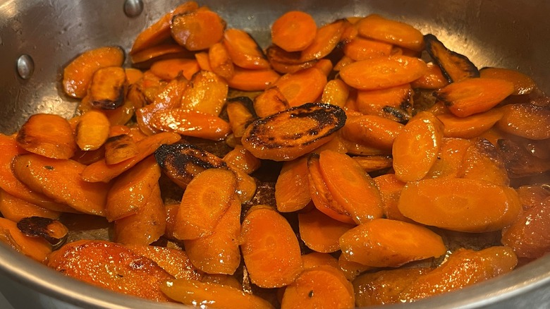 Once the carrots are tender from braising, Le Moing glazes them in honey and butter and continues to cook them until they are caramelized. Luckily, the process takes a lot less time than making a batch of caramelized onions, which might take up to an hour. The carrots in this recipe, Le Moing tells us, will caramelize in just 5 to 8 minutes thanks to the higher amount of natural sugar they contain. What's more, as she points out, "The addition of honey to the carrots not only adds sweetness but also helps speed up the caramelization process." The result is firm but tender carrots with just the right amount of sweetness to balance the umami of the shallots and the tang of the goat cheese.