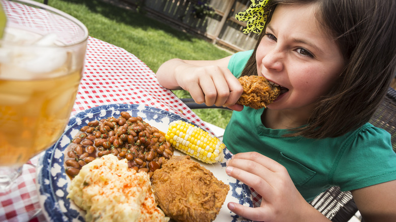 Instead of tossing it out, plan ahead and save some bacon grease from your morning breakfast or lunchtime BLT, then heat it up in your cast iron skillet. Drop that flour-coated shaken chicken into the sizzling oil, and get ready for the best fried chicken you've ever had. Enjoy a Southern-style "meat and three" with mashed potatoes, field peas, and cob corn, plus a side of cornbread and a tall glass of sweet iced tea.
