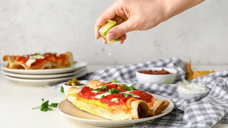 When you squeeze lime over tacos and burritos, the juice concentrates on the top layer of ingredients. As you munch, you might find yourself repeatedly squeezing more lime juice onto your meal for another hit of that punchy kick. It's a minor inconvenience, but it'll still interrupt your mealtime flow. Thankfully, there's a handy hack to ensure every bite is packed with lime goodness. Before assembling your taco or burrito, rub the inside of the tortilla with a lime wedge as you squeeze it. This clever move spreads the juice evenly, guaranteeing satisfying flavor with every mouthful.