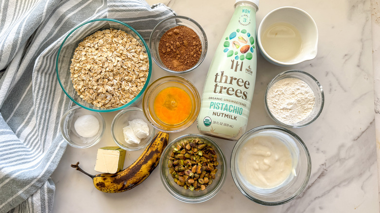 You'll also need to grab eggs, vanilla yogurt, pistachio milk, and butter. A ripe, brown-spotted banana is also essential for these muffins, but if you only have fresh ones, you can ripen bananas quickly in a pinch. Finally, check your pantry for rolled oats, baking powder, baking soda, coconut sugar, coconut oil, and all-purpose flour.