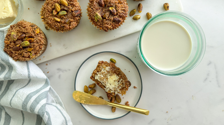 How can I make homemade pistachio milk for the muffins?