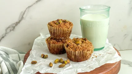 Your mornings just got a bit brighter thanks to these nourishing pistachio muffins, which come garnished with a crunchy pistachio crumble for good measure.