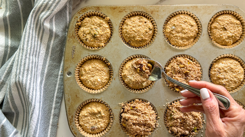 Add the crumble to the tops of the batter in the muffin tin.
