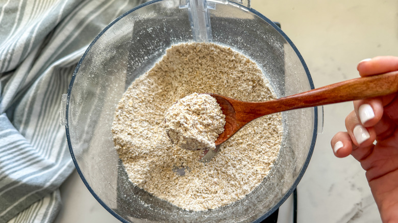To make the oat flour, add the oats to a food processor and blend until a fine flour forms.