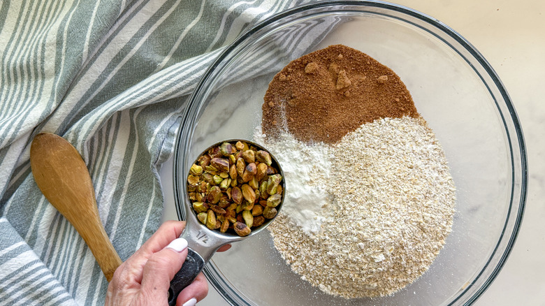 - In a large bowl combine the oat flour with the baking powder, baking soda, ½ cup coconut sugar, and ½ cup chopped pistachios.