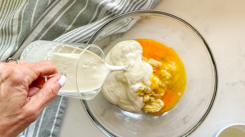 - In a medium bowl, combine the mashed banana, egg, yogurt, pistachio milk, and coconut oil.